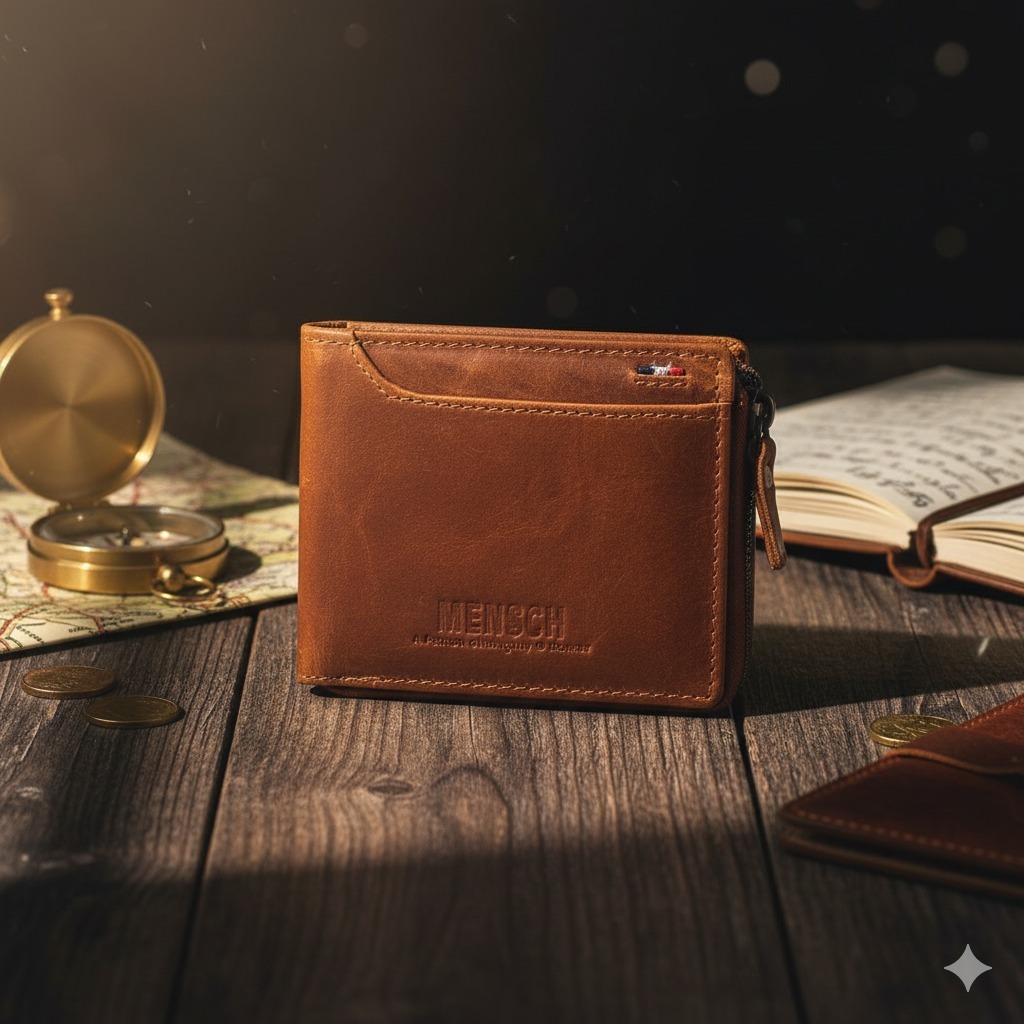Crafted for Character. Designed for the Driven. Introducing the wallet that’s more than just an accessory — it’s an extension of who you are. The MENSCH Premium Vintage Crunch Leather Wallet is meticulously crafted from rugged, full-grain leather that wears in, not out — developing a patina as unique as your journey. Key Features: Vintage Crunch Leather: Rich in texture and personality, the distressed finish highlights natural grain patterns, making every wallet one of a kind. Secure Zip-Around Closure: Wrapped in a durable zipper with snap loop detail, this wallet keeps your essentials safe — wherever life takes you. Smartly Designed Interior: Centre flap with easy-access coin pocket Ample card slots for streamlined organization Transparent ID window and additional sleeve for quick viewing Separate currency compartments to sort bills with ease MENSCH Signature Embossing: Proudly stamped with our emblem of integrity, stitched with finesse for a bold yet timeless look.